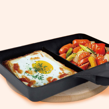 忙しい朝は、中央に間仕切りのあるツインパンが大活躍。ウィンナーと目玉焼きを同時に調理して朝の準備も大幅に時間短縮できます。